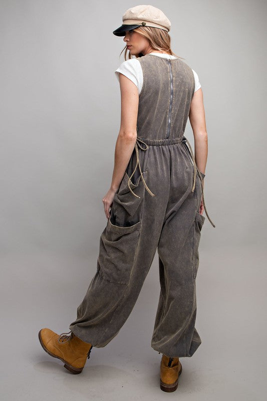Mineral Washed Cargo Jumpsuit With Elastic Tie Waist