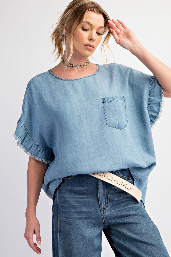 Mineral Washed Loose Fit Denim Top With Short Sleeves and Round Neckline